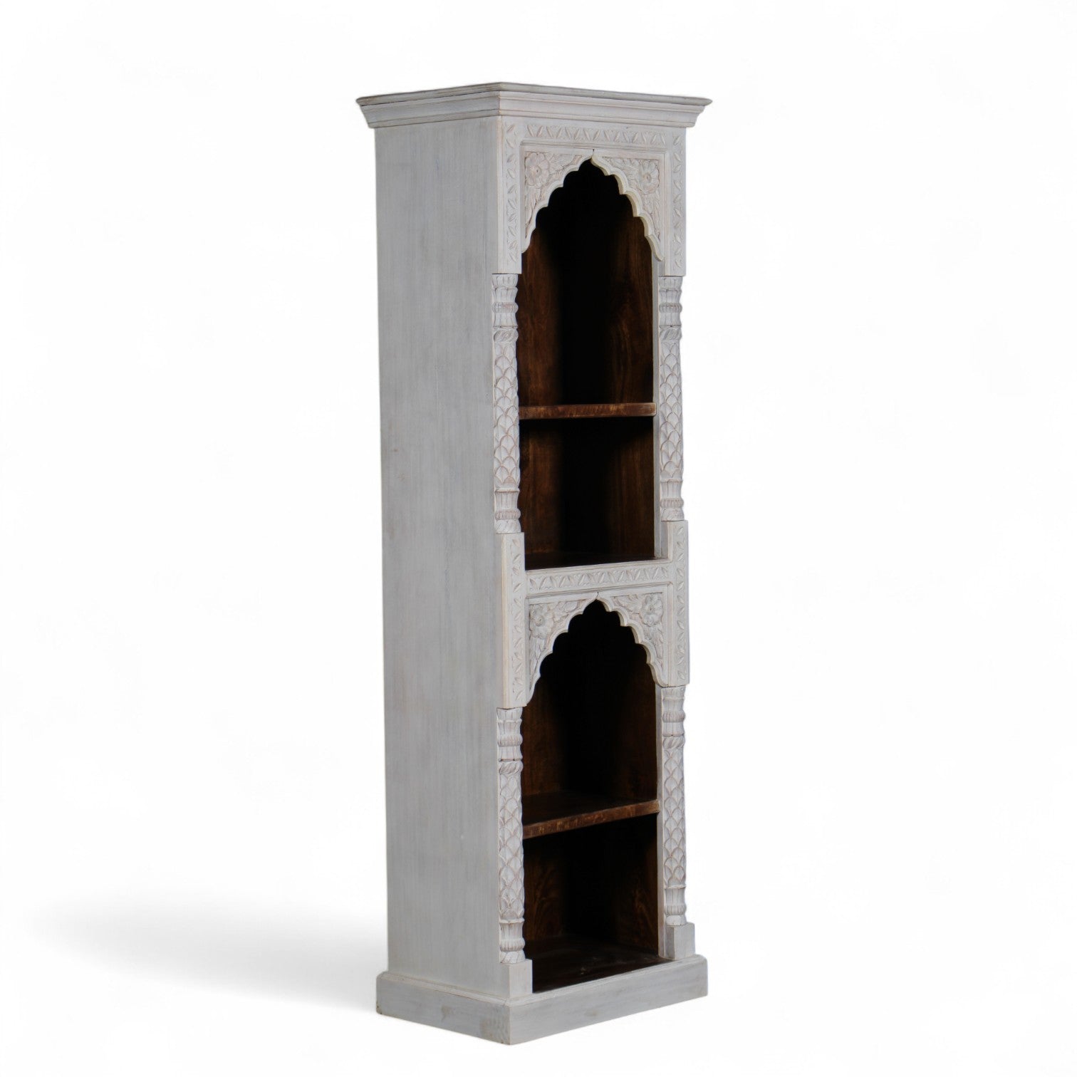 Step into a world of heritage and craftsmanship with our Archway Tall Shelf. Inspired by traditional Indian palace architecture, this sculptural piece features hand-carved arch details that echo the elegance of bygone eras. Crafted from solid wood with a distressed whitewash exterior and contrasting natural timber interior, this shelf effortlessly blends old-world charm with modern function.
