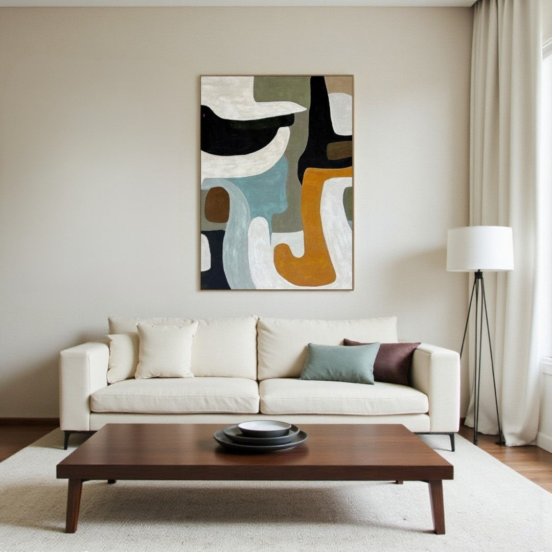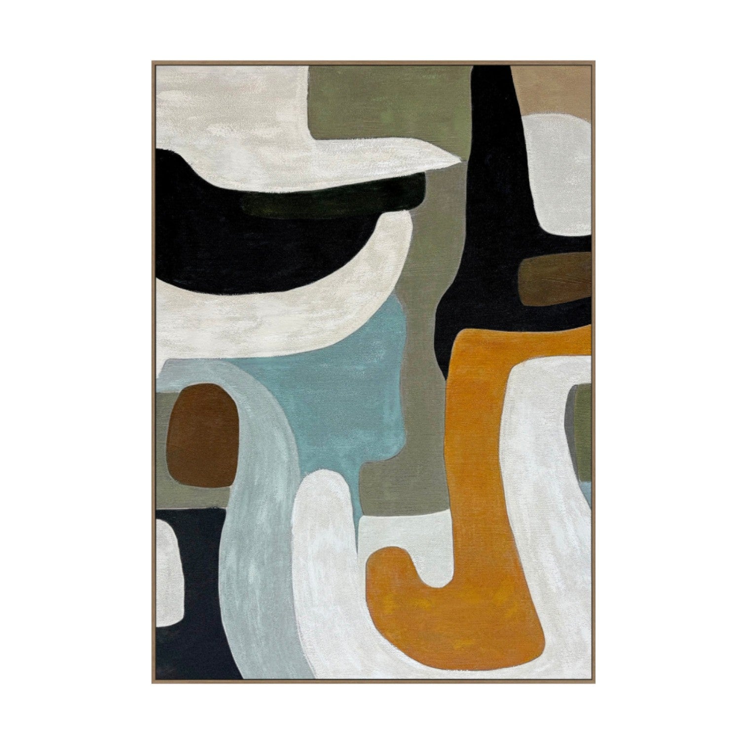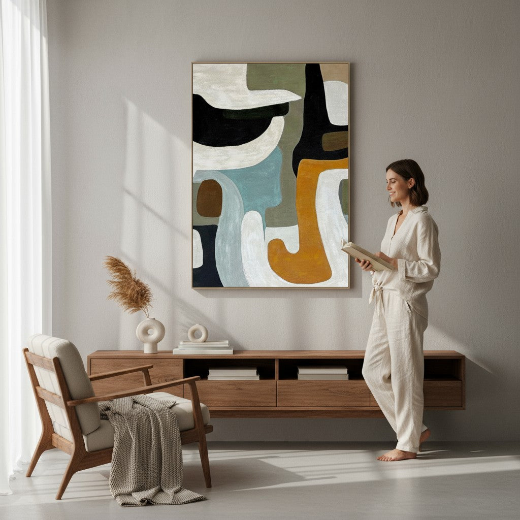 Featuring a harmonious blend of earthy tones — clay, ivory, sage, black, and muted blue — this abstract composition adds warmth and depth to any interior. The fluid forms and layered textures evoke a sense of movement, creating a statement piece that feels both modern and organic.