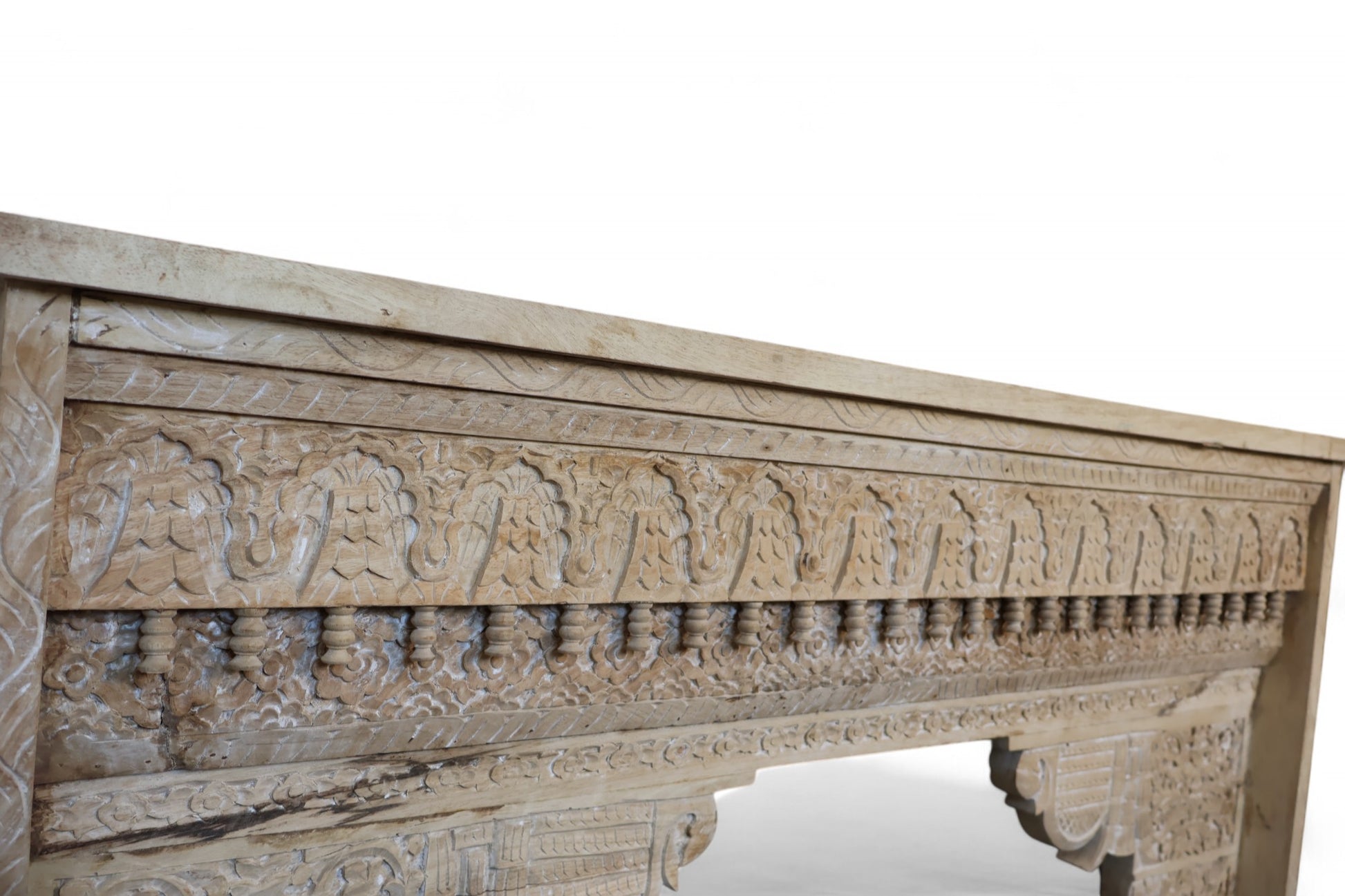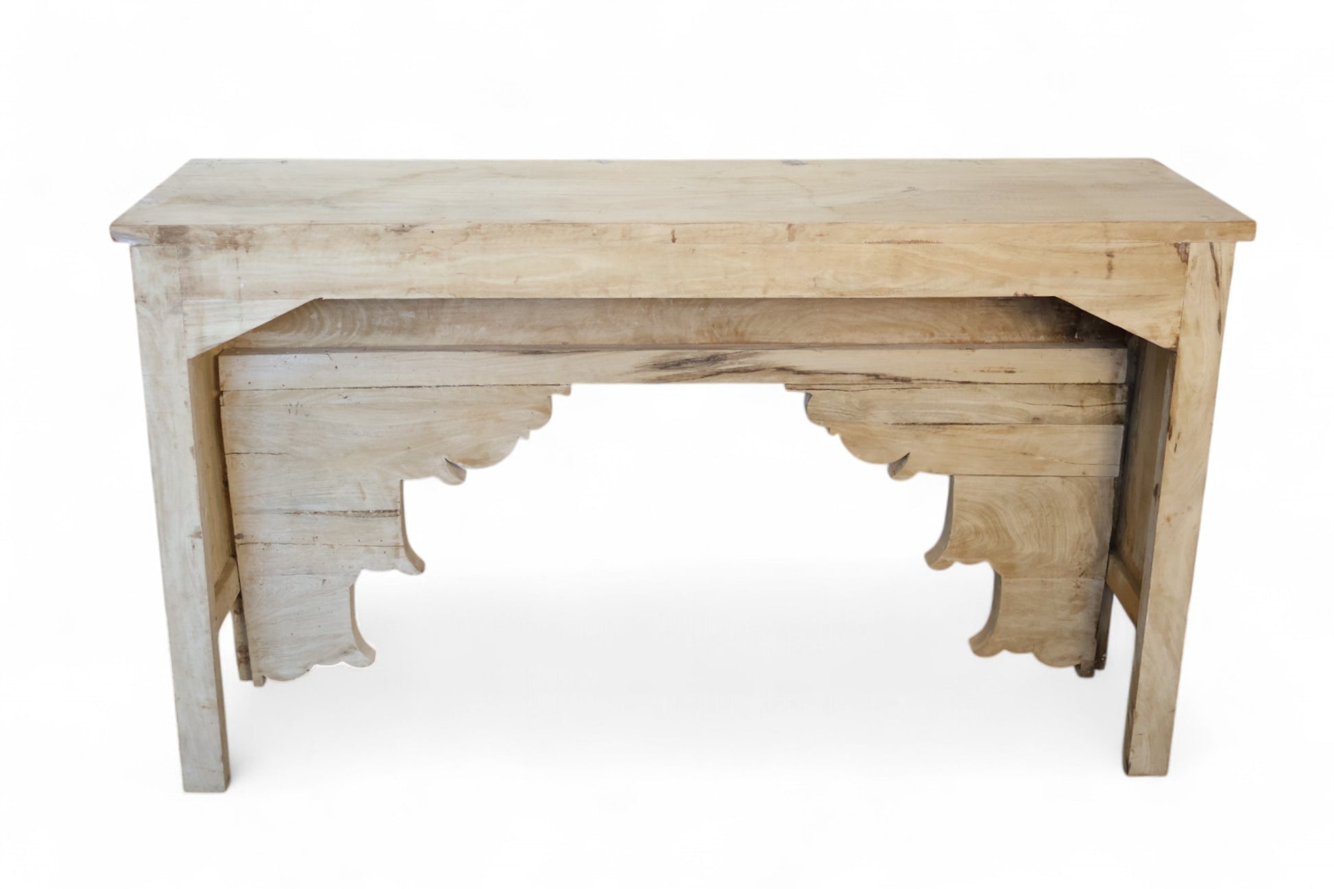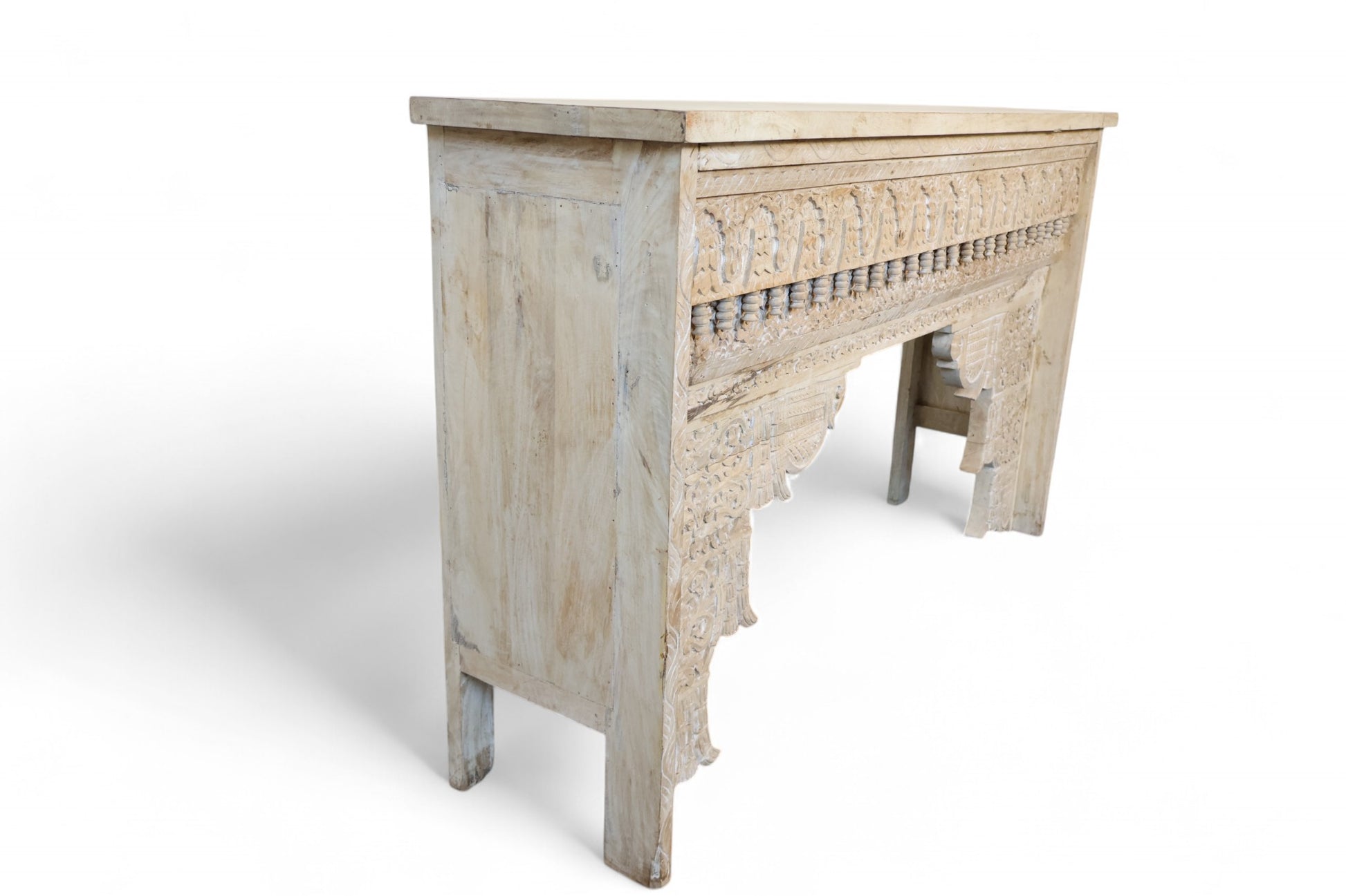 Live green with a touch of sustainability to your home. Crafted from reclaimed door panels sourced from Rajasthan, this vintage Indian console is truly one-of-a-kind. Made from solid mango wood and hand carved, it adds a touch of history and unique charm to any space. The whitewash finish gives it a rustic feel, making it a versatile addition to your home. This unique piece not only adds visual interest but also makes a conscious eco-friendly statement. A stylish and responsible choice for any home.