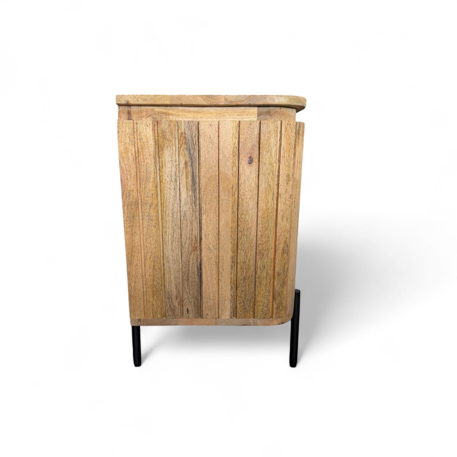 The Nero Bedside Table combines modern simplicity with the natural warmth of solid wood craftsmanship. Designed with vertical slatted panels and a soft rounded silhouette, it showcases the rich tones and textures of sustainable mango wood. The matte black metal legs add a contemporary edge, creating the perfect balance between organic and industrial design.