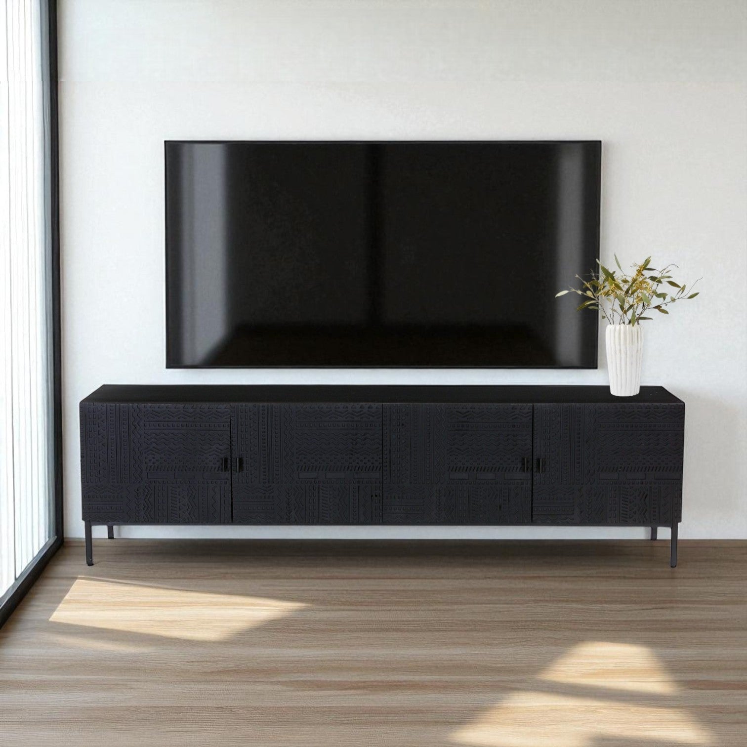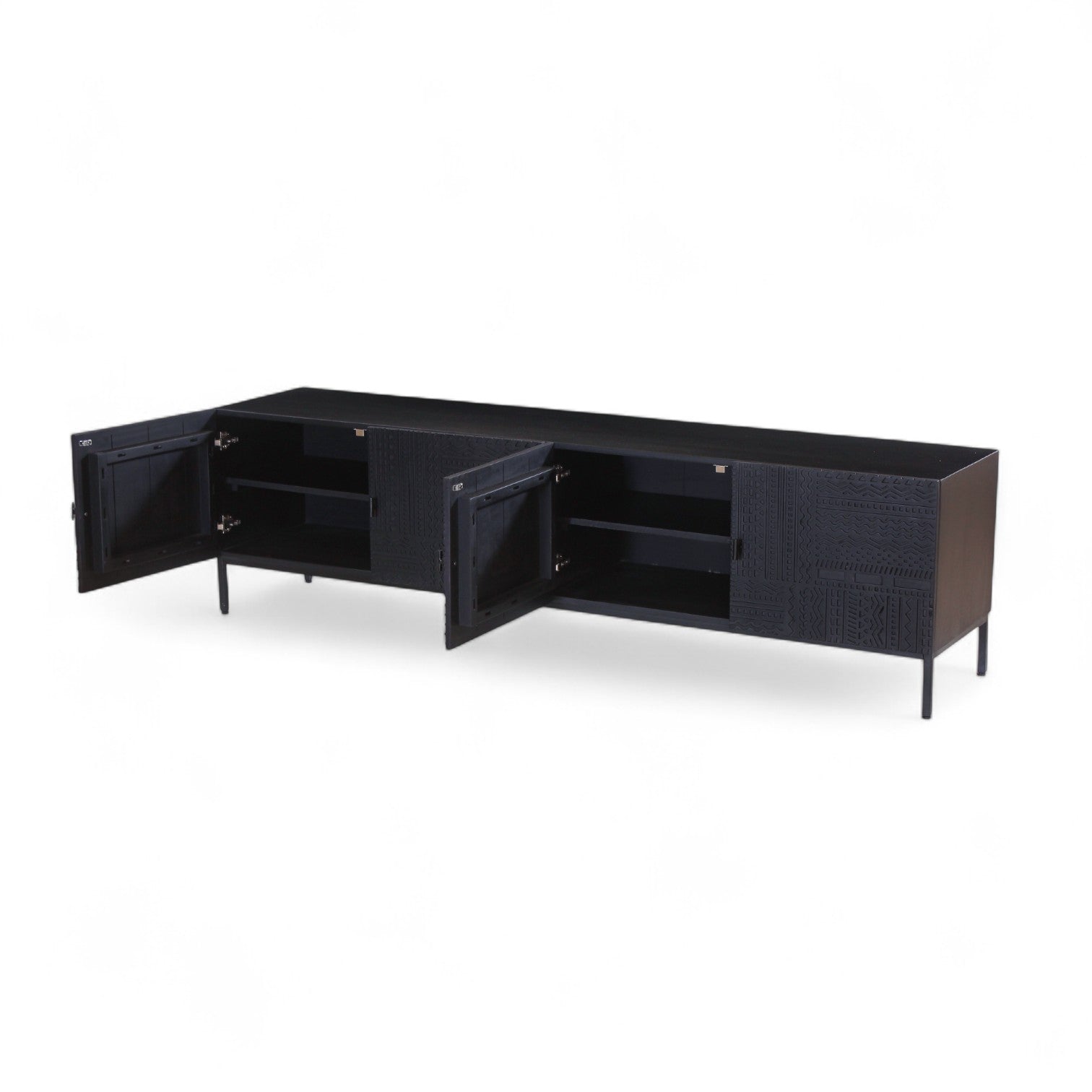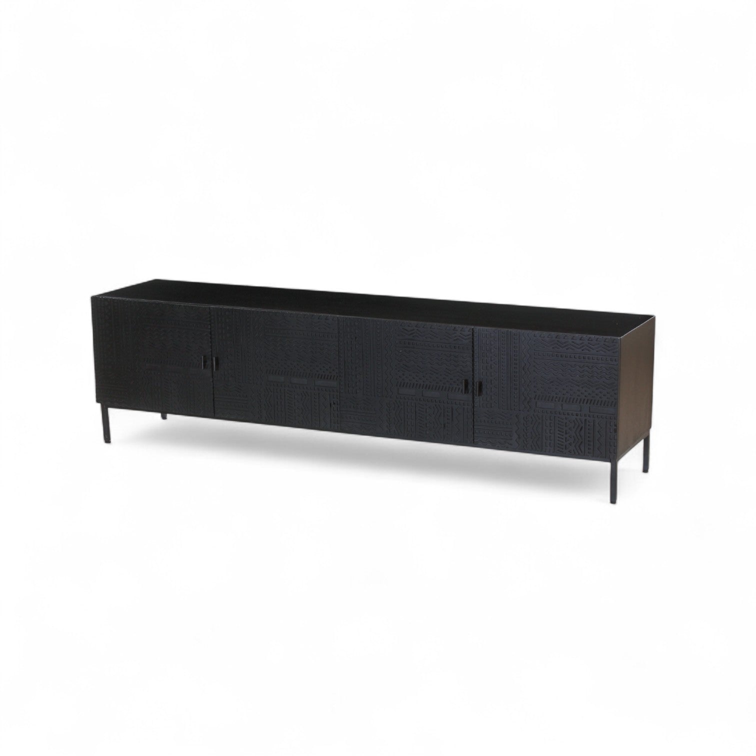 The Rare Carved Black Entertainment Unit brings bold sophistication to modern interiors. Handcrafted from solid wood, it features intricately carved doors in a tribal-inspired motif, adding texture and artistry to your space. Finished in a deep matte black with slender metal legs, this unit offers concealed storage and a striking presence—perfect for your media setup or statement styling.