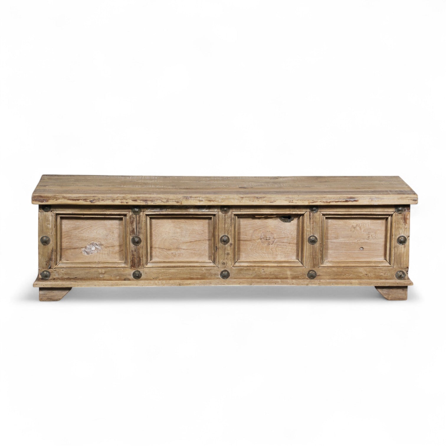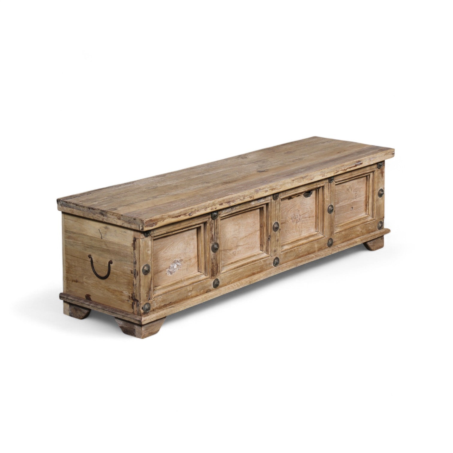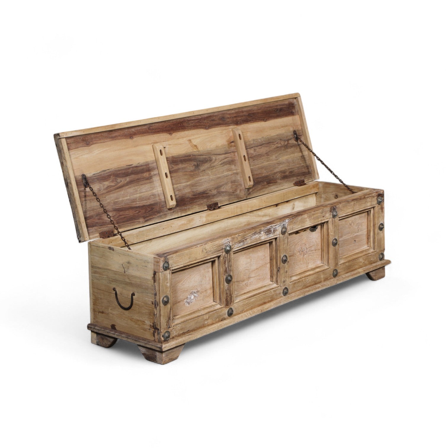 Bring character and practicality to your space with the Veda Trunk. Handcrafted from reclaimed wood, this versatile piece blends rustic charm with a functional design, making it a standout addition to your home. Its natural weathered finish and original hardware details tell a story of heritage and craftsmanship, while the spacious interior provides ample storage for blankets, cushions, or keepsakes.